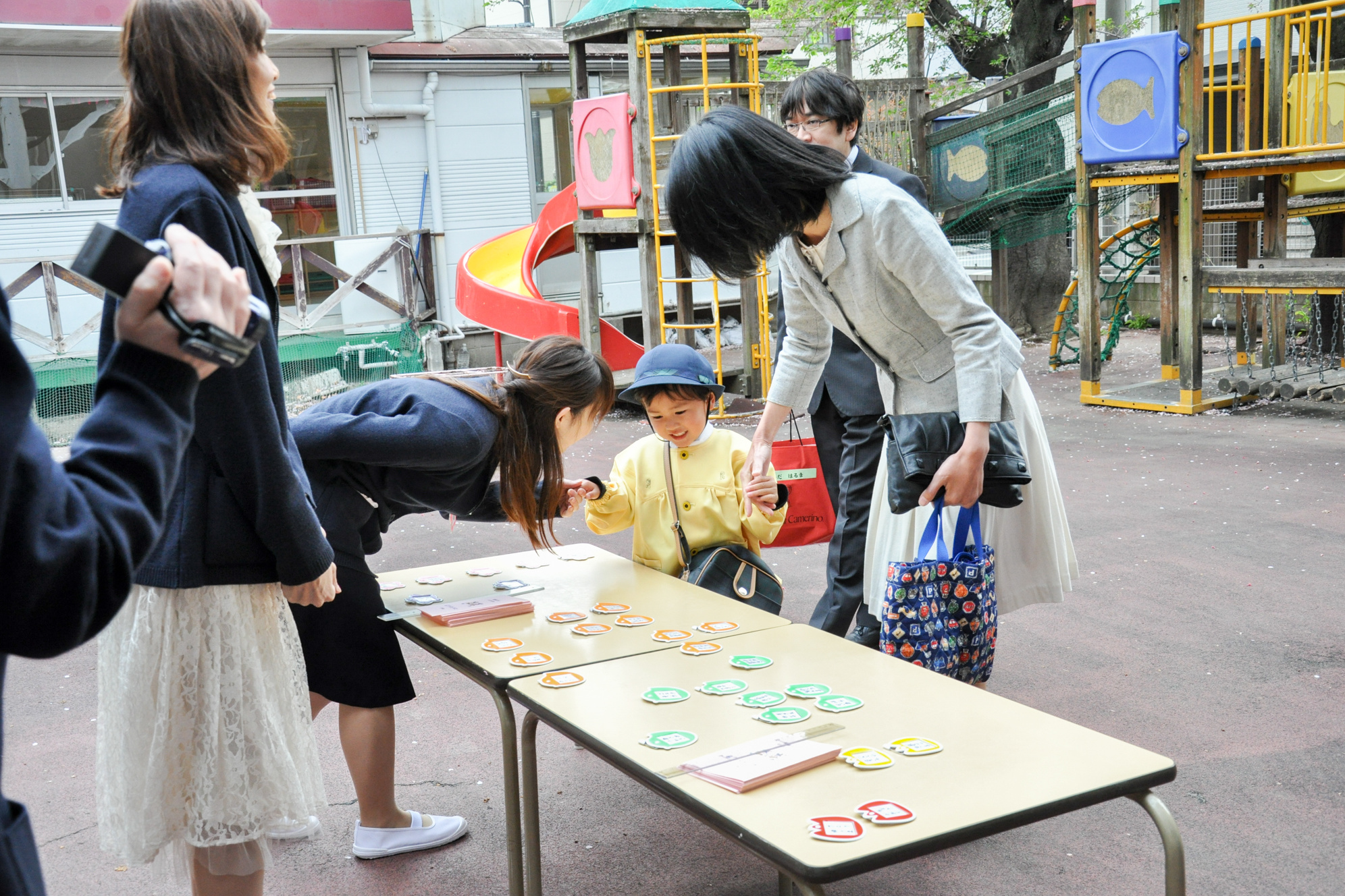 通園カバンや帽子をロッカーにかけて、おたより帳に出席シールを貼ります。