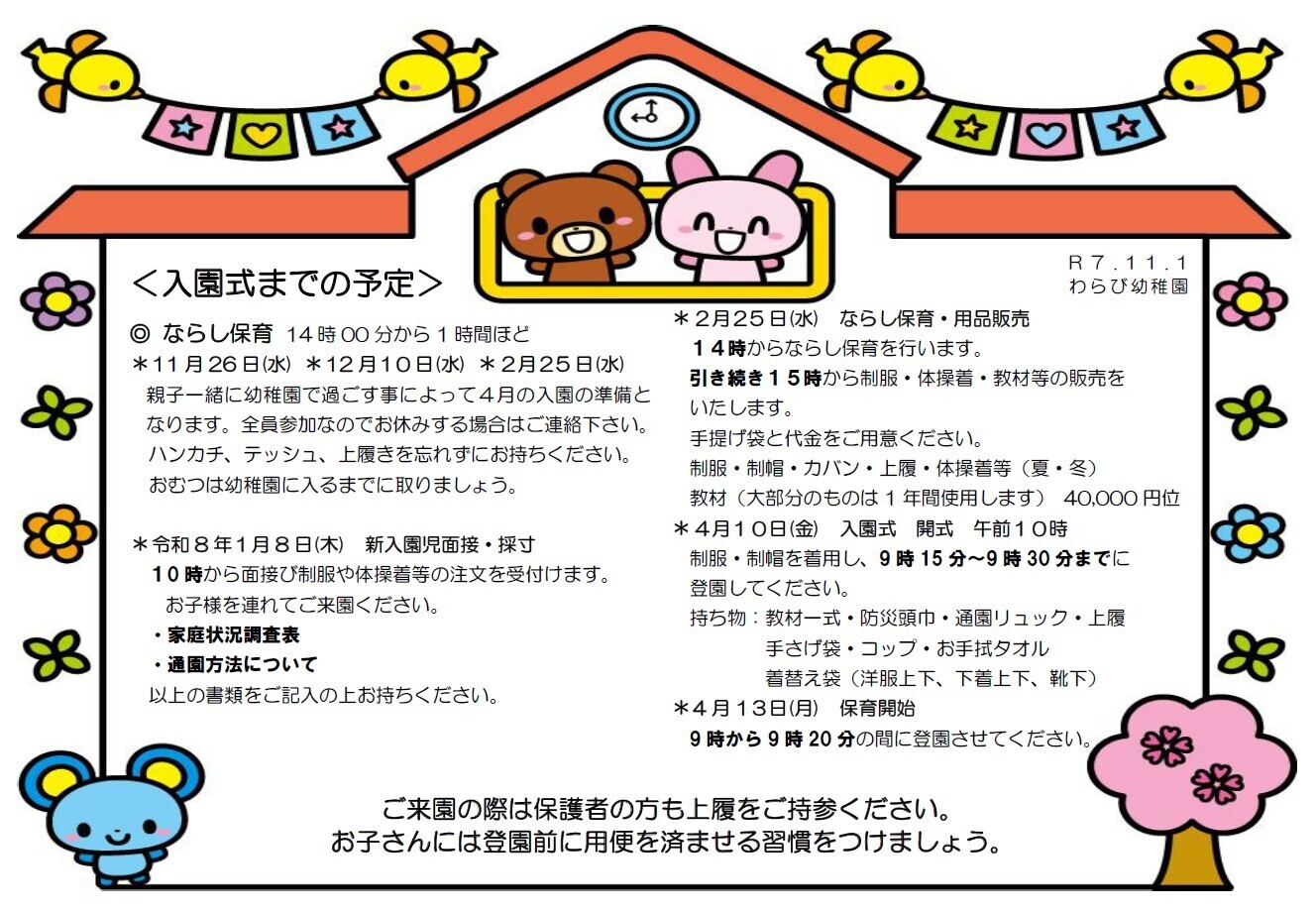 ※11月4日(火)以降に入園面接をご希望の方はあらかじめご連絡ください。